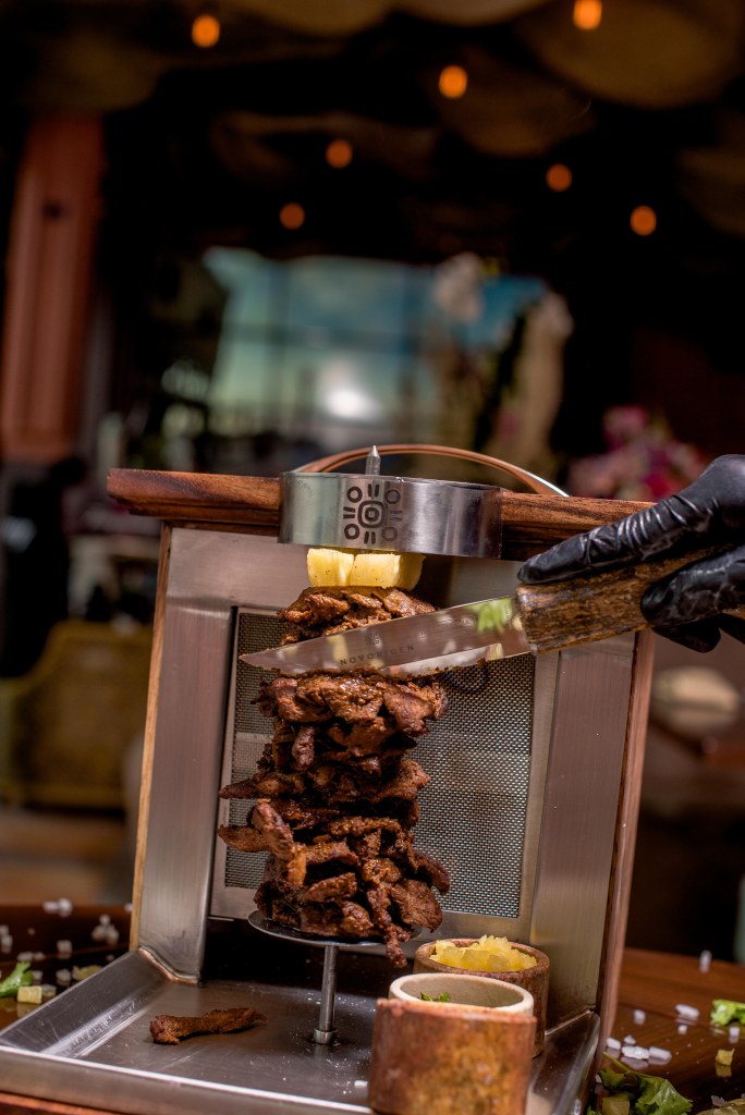 Posteriormente el restaurante presentó el nuevo integrante de su menú “LA MINI PASTORA DE ARRACHERA” una pequeña que a todos conquista por su sabor, el platillo consiste en carne arrachera montado en un mini pastor con piña asada, cebolla, cilantro y limón servidas en tortilla azul.